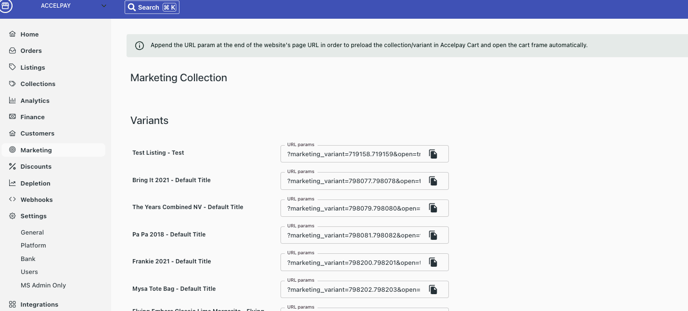 - Copy and Paste the URL param at the end of the website's page URL in order to preload the collection/variant in the AccelPay Cart and open the cart automatically.