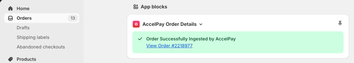 - Once set up, every order will have a App block, indicating whether or not the order imported successfully.