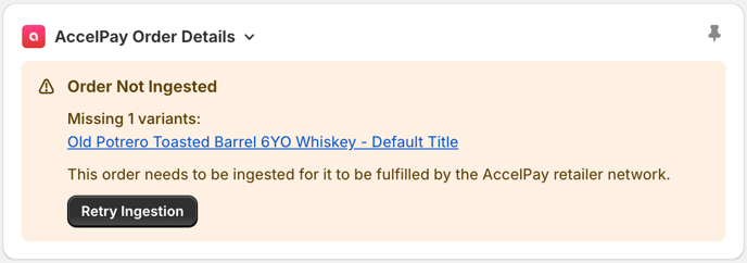 The AccelPay Fulfillment App in your Shopify store ingests every order from Shopify to the AccelPay Portal. For this import to work, all products available in Shopify must be mapped in the AccelPay Portal.